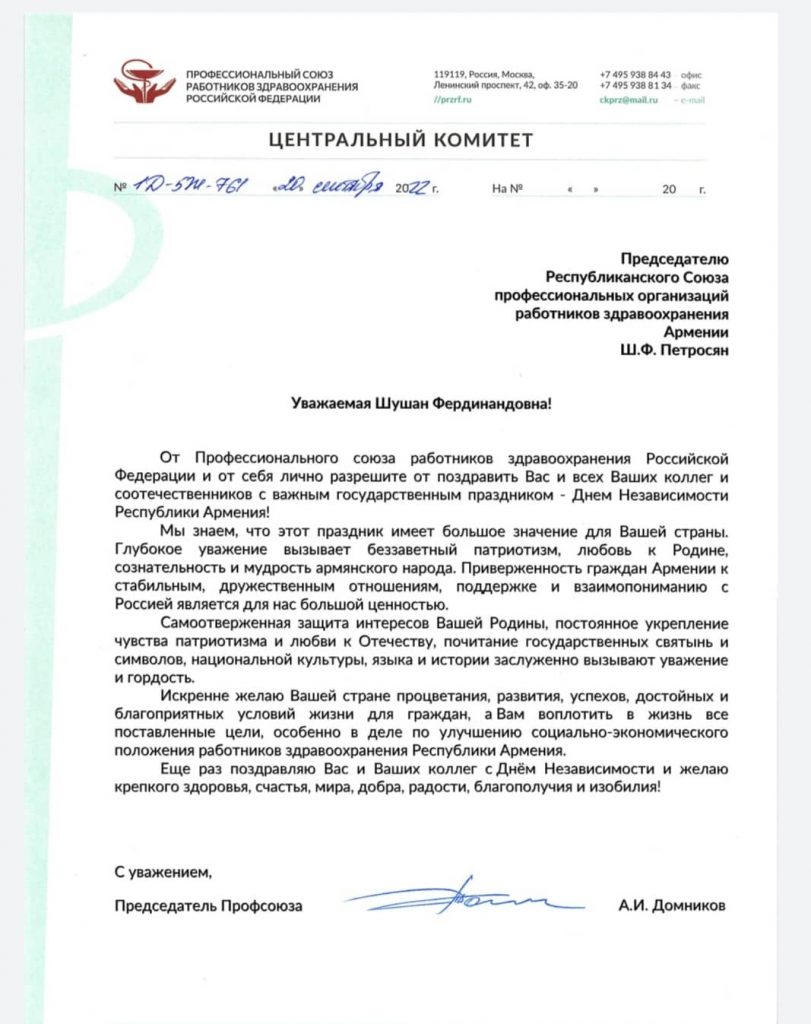 Առողջապահության աշխատողների արհմիությունների միջազգային կոնֆեդերացիայի նախագահ Անատոլի Դոմնիկովի ուղերձը՝ Հայաստանի Հանրապետության Անկախության օրվա կապակցությամբ: